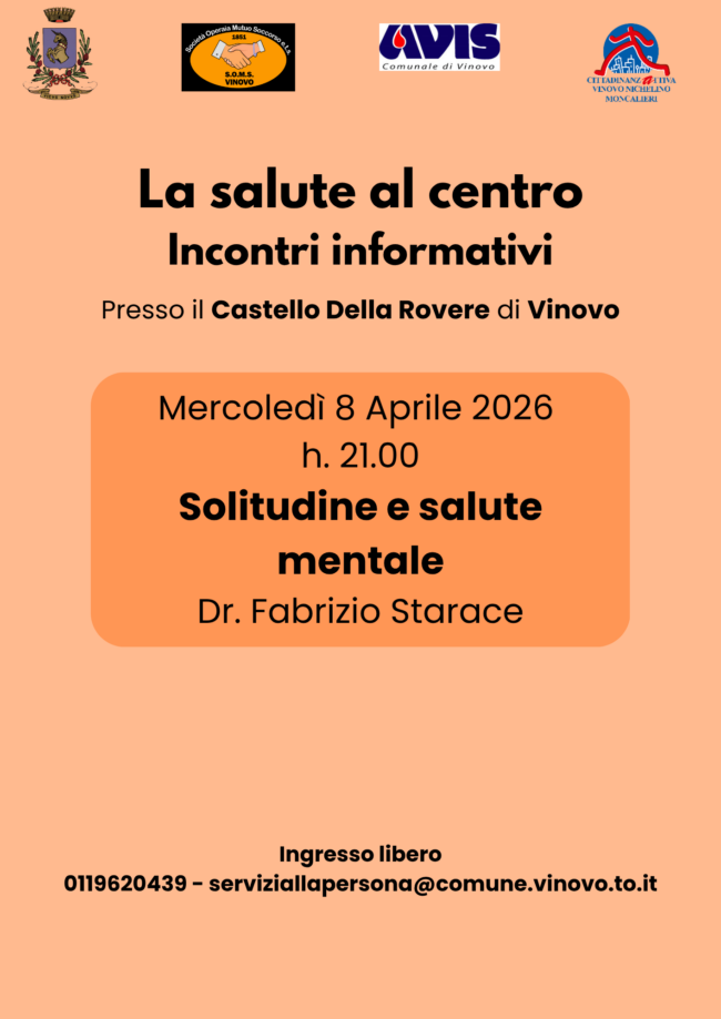 Mercoledì 8 sera si esce! 🌙 Ma per una cosa interessante: c’è l’incontro ‘Solitudine e salute mentale’ al Castello di Vinovo. Un modo per capirne di più e stare insieme. 🗣️ Ingresso libero, ore 21:00. Non mancare!